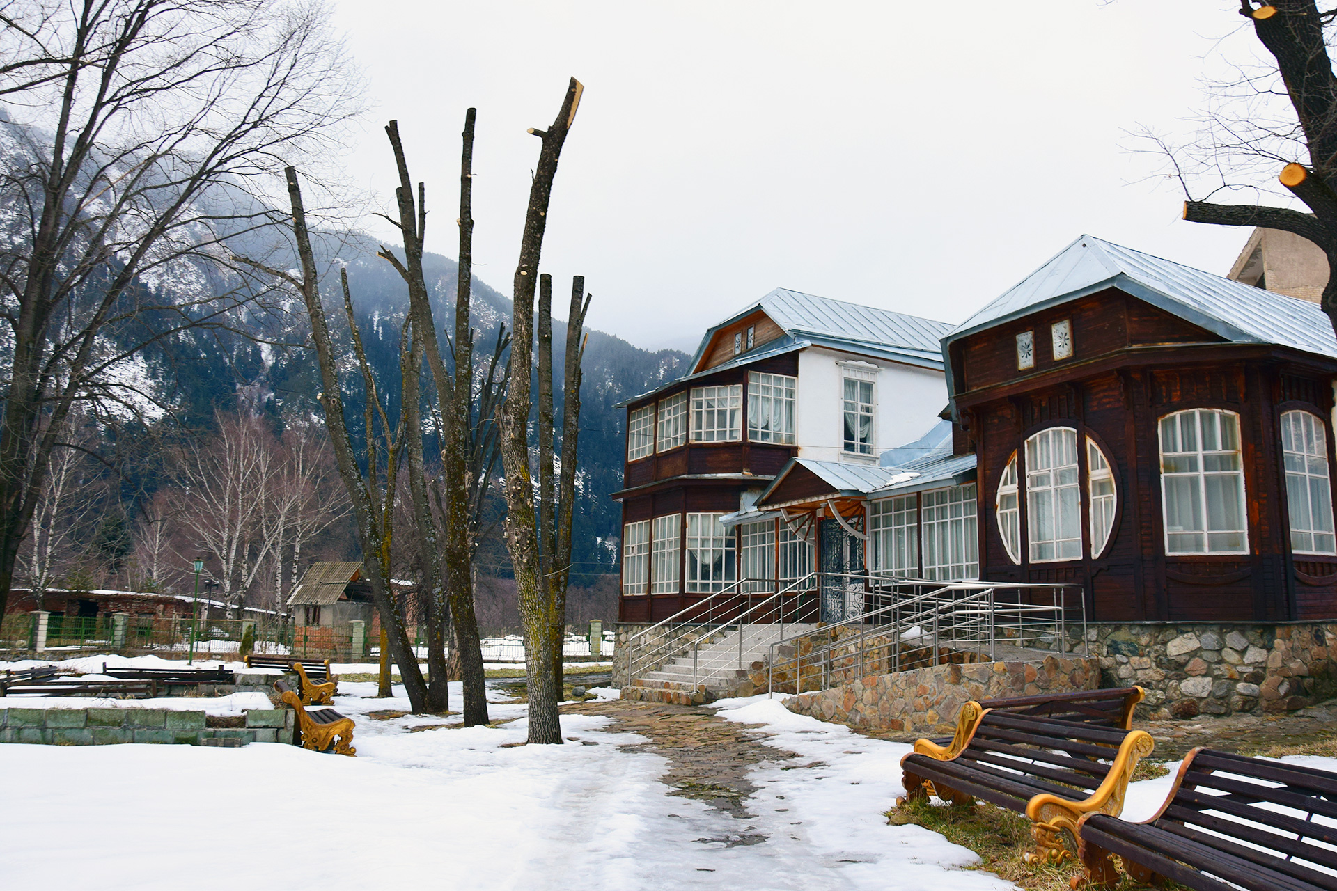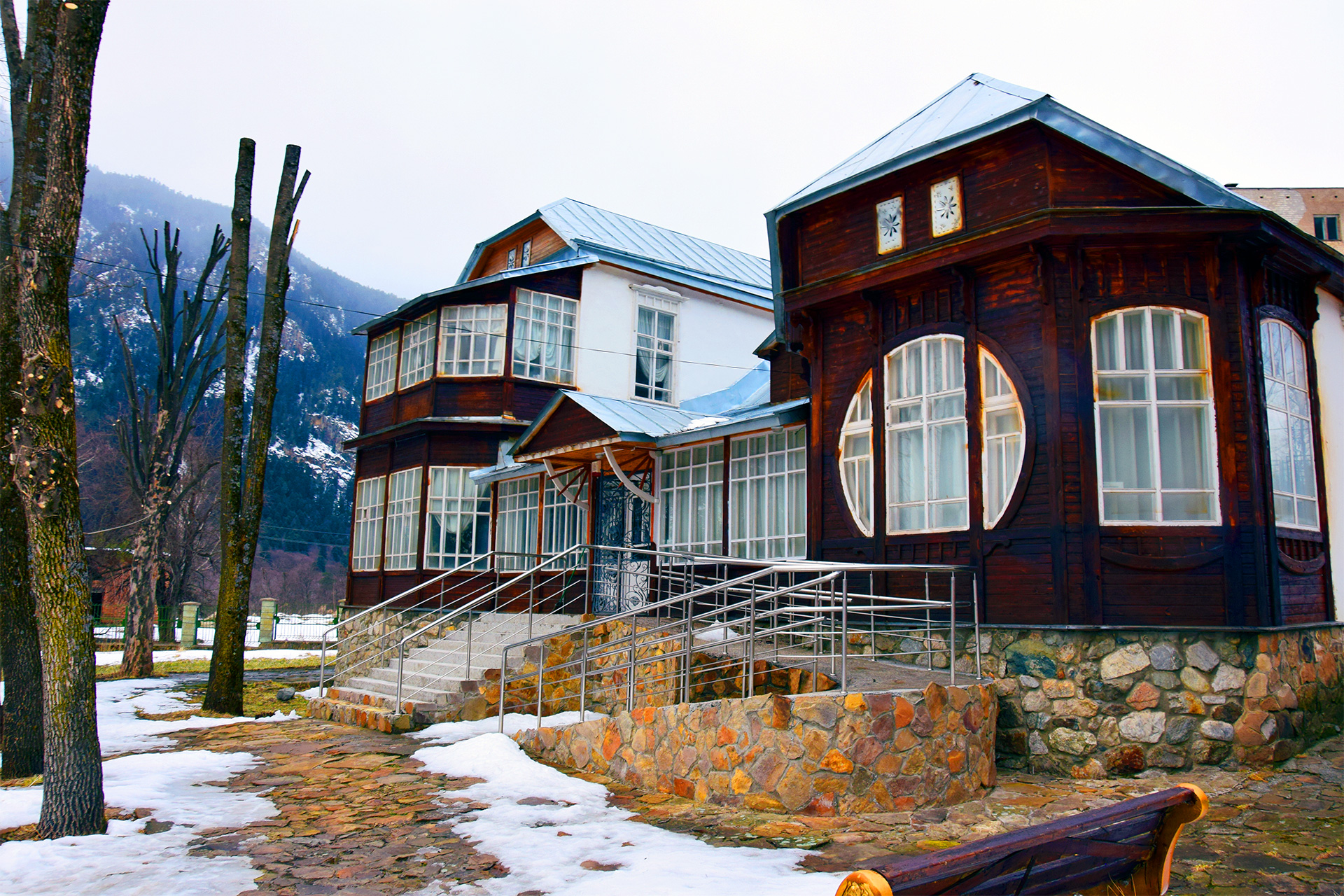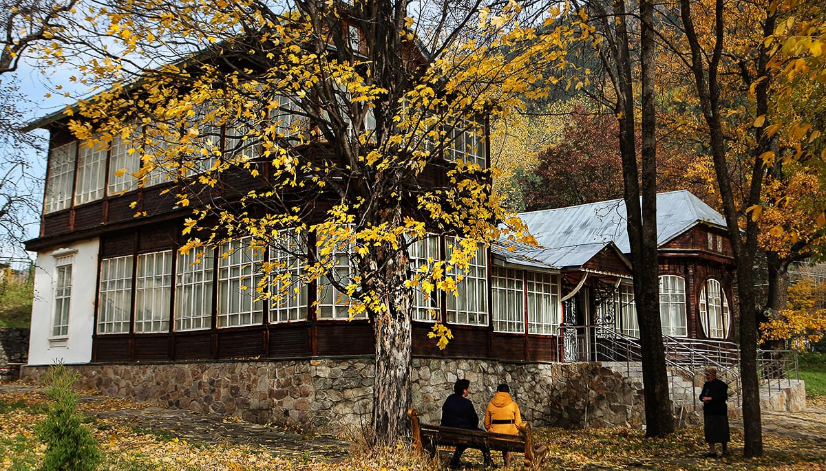 Золотое солнце и острые белоснежные вершины на ультрамарине неба, прозрачные горные реки, водопады и чаши озёр под ними — это Теберда — жемчужина в ожерелье курортов России, край нарзанов и эдельвейсов. В 1893 году, именно здесь, Ислам Крымшамхалов построил дом в живописном месте Теберды вблизи горного озера Кара – Кель. В нем воплотился талант Ислама Пашаевича и его опыт, как архитектора. Дом, фасад которого объединял в себе уже устоявшиеся традиции классики и вместе с тем что-то современное, разительно отличался от местного зодчества. Построенный в стиле модерн из срубленных в этом заповедном крае сосновых бревен, он представляет собой сочетание простоты и легкости, красоты и современности. Здание слагается из центрального одноэтажного объема с просторным парадным холлом и примыкающих к нему двух флигелей — одноэтажного и двухэтажного.